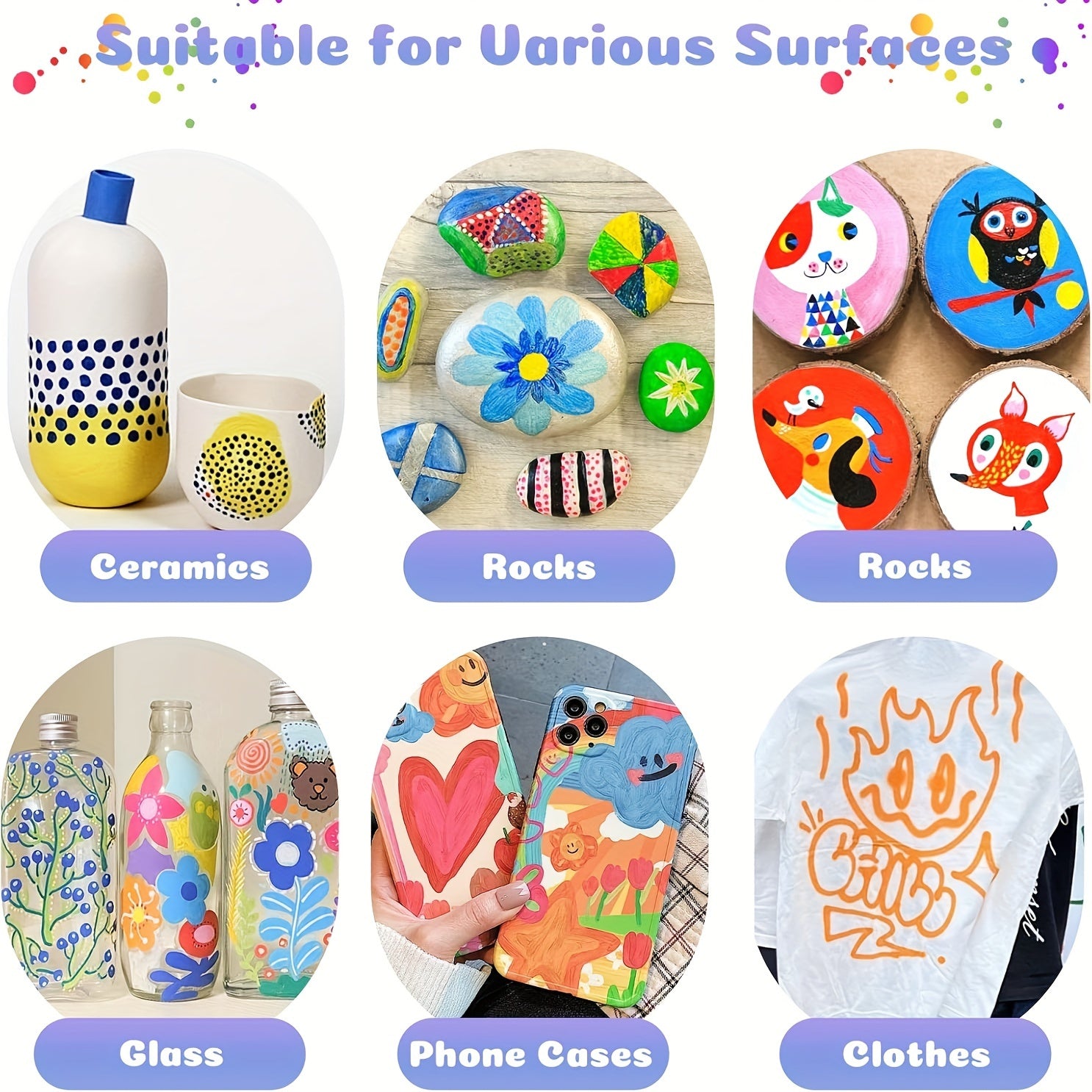 - Applications variées: peinture, dessin, marquage, coloriage et esquisses sur bois, roche, verre, toile et pierre.