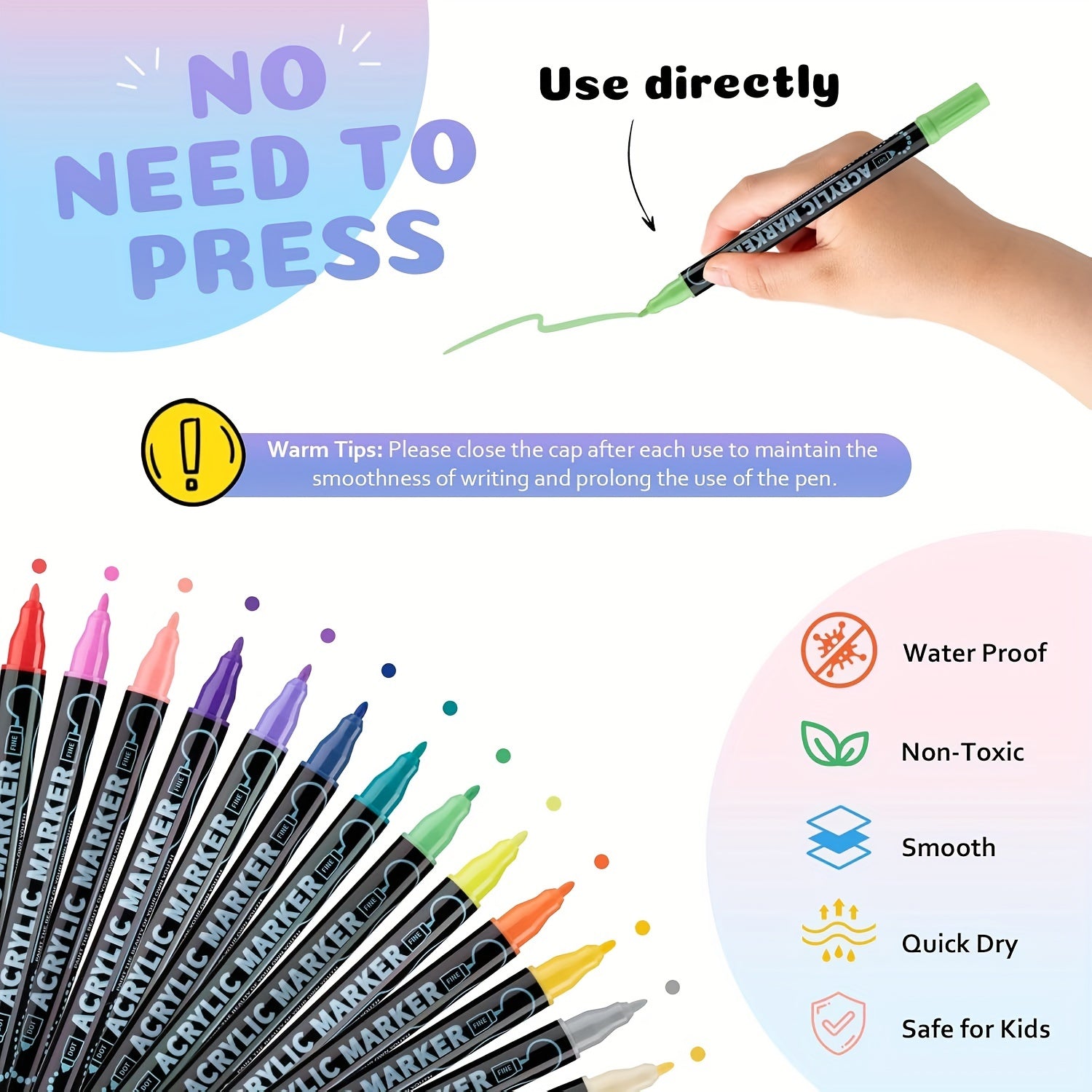 Libérez votre créativité avec ces marqueurs acryliques à double pointe, un ensemble premium de 36 couleurs conçu pour les artistes et les passionnés de DIY. L’encre acrylique de haute qualité offre une application fluide et des résultats nets sur une variété de supports, pour des créations aussi vibrantes que durables.