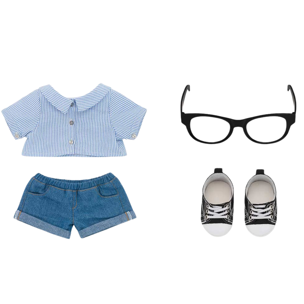 Accessoires inclus : lunettes, chemise rayée, jean et baskets